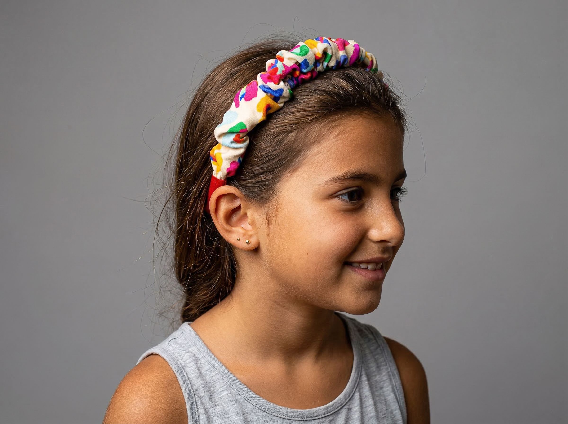 The Arty Party Scrunchieband said 'boring is not on the schedule today' — and we fully agree! Thick, ruffy, and scrunchie-soft, it's wrapped in a cream base splashed with wild multicolour abstract blobs — think pink, green, blue, yellow, and red all living their best life together. The kind of headband that shows up and steals the whole look — whether it's a playdate or a party or just a Wednesday that needs a glow-up.