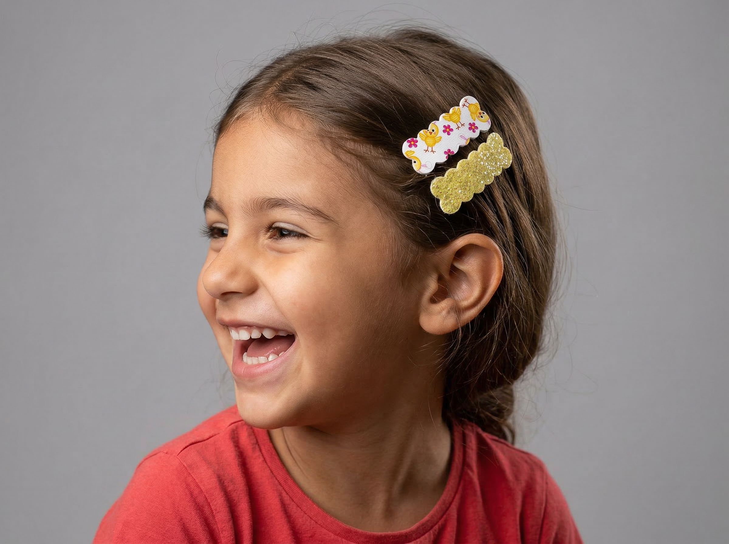 The Chick Parade Hair Clips — a two-clip set that's basically a tiny spring festival for her hair! One wavy-edged clip is packed with marching yellow chicks and hot pink flowers on white, while the second is pure yellow glitter magic with the same sweet scalloped shape.