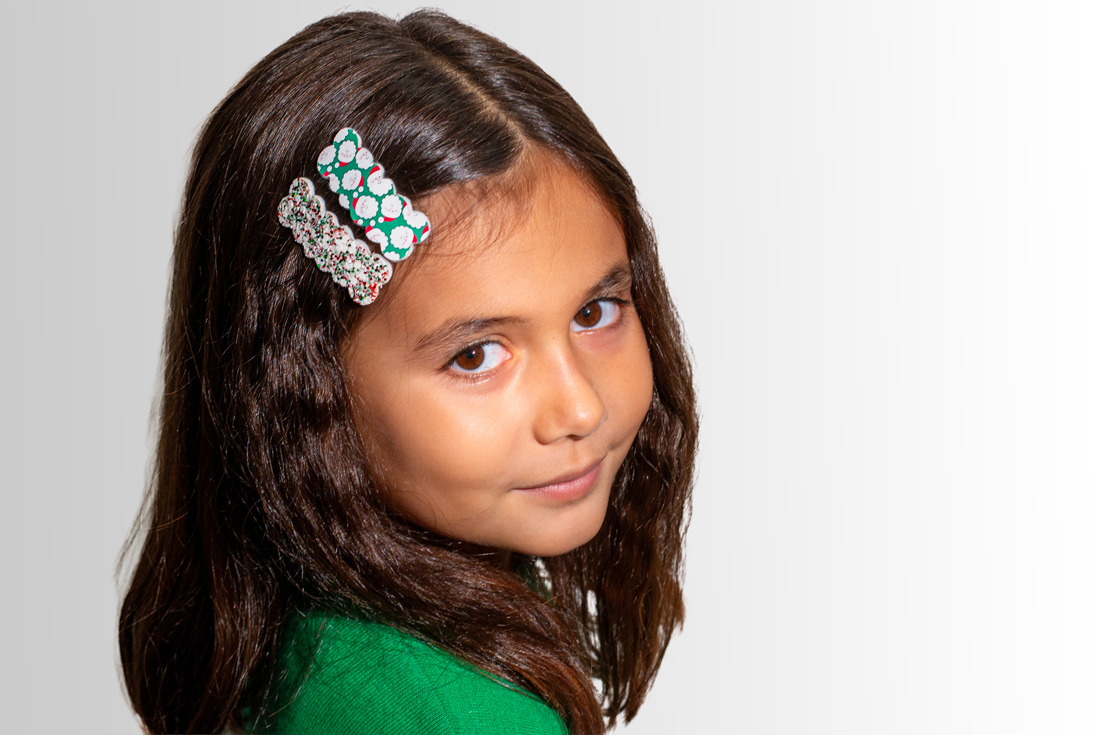 The Santa Sprinkles Hair Clips mix holiday fun and sparkle — one green clip full of Santa faces, and one white glittery piece sprinkled with Christmas confetti. A merry duo that’s made to spread joy (and a little sparkle) all season long!