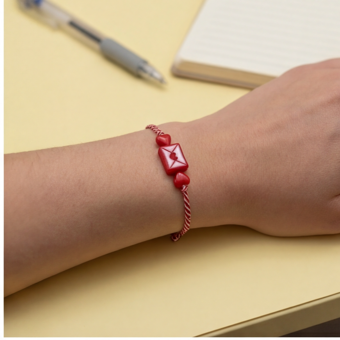 A tiny love letter envelope charm sits between two red heart beads on a classic red and white twisted cord. Adjustable fit — one size fits all wrists.